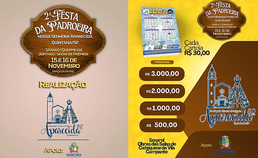 A cidade de Quintana se prepara para viver um dos momentos mais marcantes de seu calendário religioso e cultural: a 2ª Festa da Padroeira Nossa Senhora Aparecida, que acontece no próximo fim de semana (sexta e sábado - dias 15 e 16 de novembro), na tradicional Praça da Matriz.