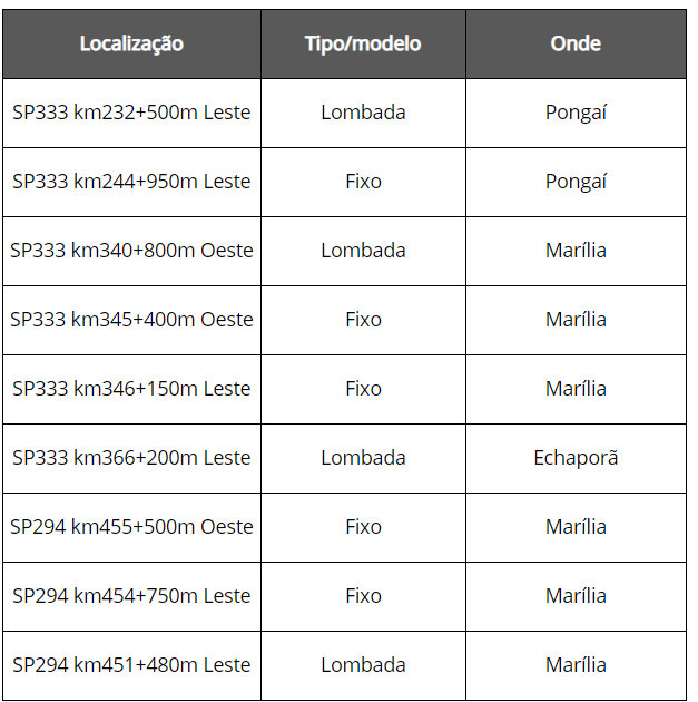 A velocidade regulamentada nesses trechos com a presença de radares varia de 60 a 80 km/h.