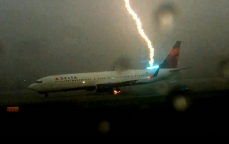 Um passageiro que esperava uma tempestade passar para embarcar em seu voo flagrou o momento em que um raio atingiu outro avião.