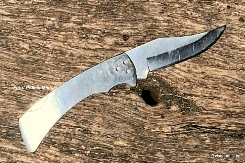 Os policiais militares iniciaram de imediato um patrulhamento pelo distrito e conseguiram encontrar este suspeito na arquibancada de um campo de futebol próximo ao local. Ele foi reconhecido pela vítima como sendo um dos assaltantes. O canivete usado na tentativa de assalto (foto) foi apreendido.