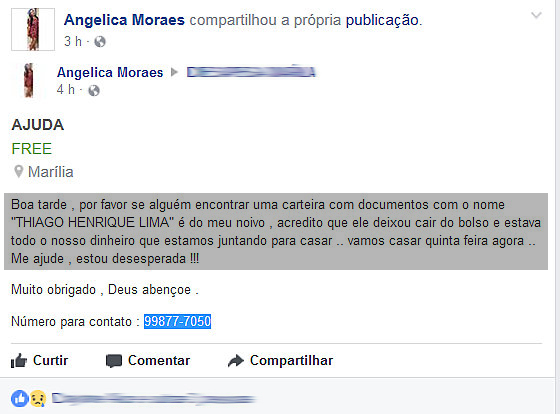 O caso, ocorrido esta semana em Marília, teve grande repercussão. É que a noiva ficou desesperada ao saver que o rapaz tinha perdido a carteira com todos os documentos e também o dinheiro que arrecadou para o tão sonhado "sim". Ela passou a pedir ajuda pelas redes sociais.