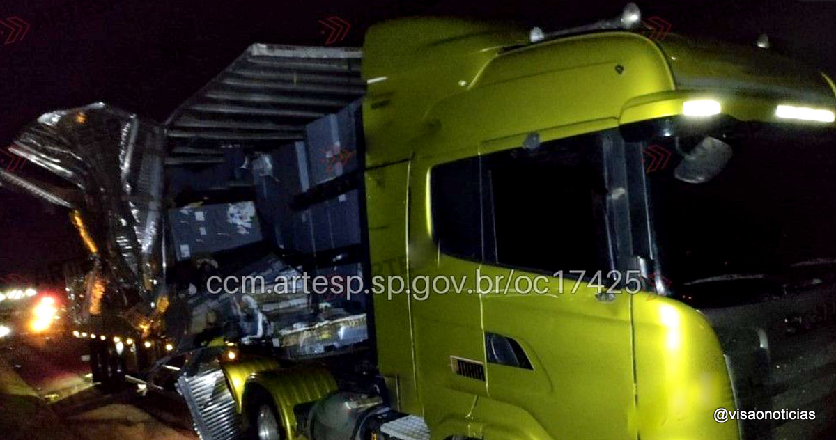 Embora os motoristas das carretas não tenham sofrido ferimentos, o compartimento de carga da carreta do Mercado Livre ficou bastante danificado e muitas encomendas ficaram espalhadas pela pista.