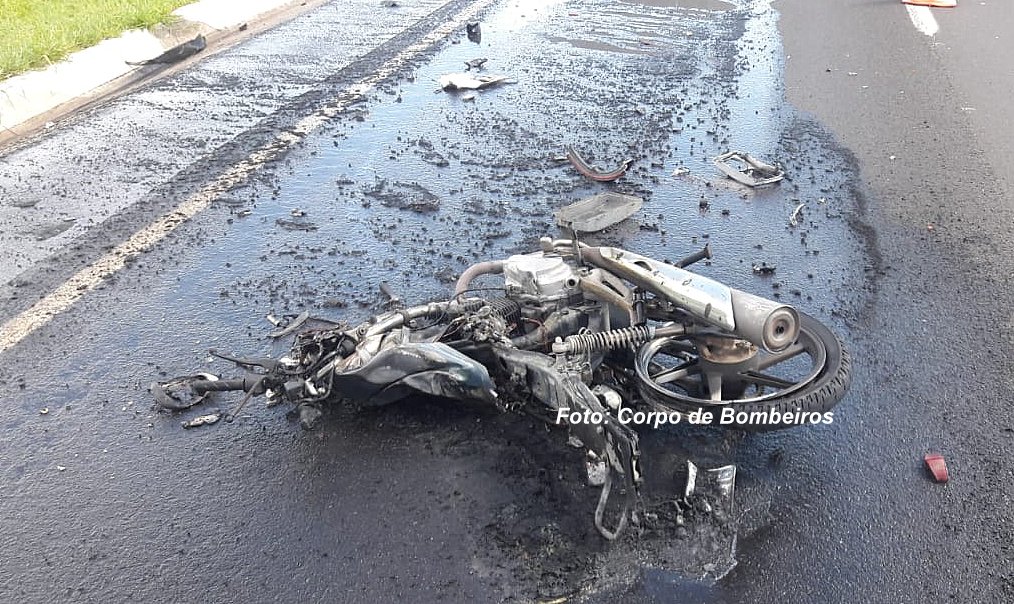 Veículos bateram de frente e, com o violento impacto, a motocicleta chegou a pegar fogo. Vítima morreu no local.