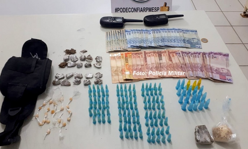 Ao perceber a aproximação dos PMs, tentou fugir mas não conseguiu. Dentro da pochete foram encontradas: 109 porções de crack, uma pedra grande da mesma droga, além de 23 porções de maconha e 21 de cocaína, bem como 245 reais em dinheiro e os dois rádios de comunicação.