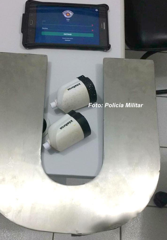 Na busca pessoal foram localizados nos bolsos da calça duas câmeras de monitoramentos e também um objeto de metal ( letra "U" ).