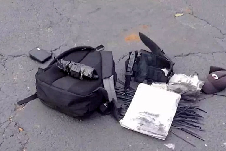 Na mochila, foram encontrados duas facas, uma arma de choque e um explosivo falso. Em nota, a Secretaria de Segurança Pública informou que solicitou perícia e que o caso foi registrado como ameaça, legítima defesa e lesão corporal decorrente de intervenção policial.