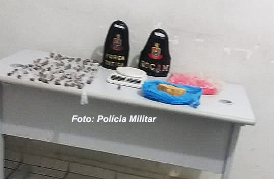 No local, foram apreendidas 103 porções de maconha, uma pedra grande de crack, fragmentos das drogas, uma pequena balança de precisão, além de vários pinos vazios que seriam utilizados para embalar os entorpecentes.