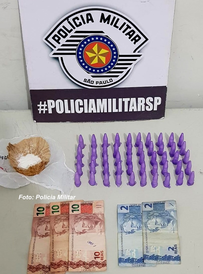 Com o rapaz de 19 anos foram encontrados 50 pinos com cocaína. Já com o jovem de 18 anos foram localizados a "trouxinha" de papel, também com cocaína a granel e R$ 34,00.