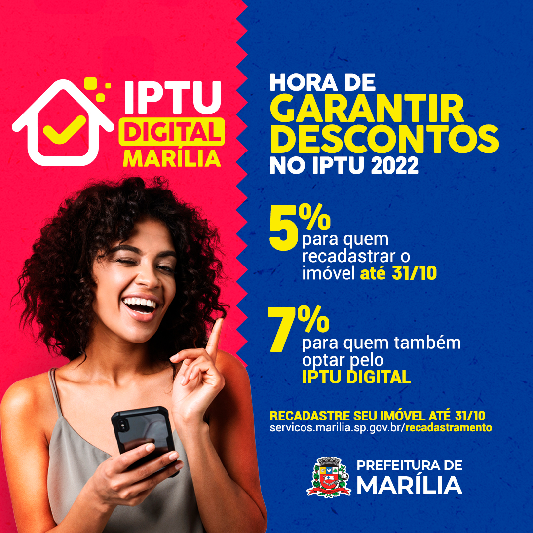 A Prefeitura de Marília prorrogou até o dia 31 de outubro de 2022 o prazo de recadastramento de imóveis com atualização de informações e dados em medida que impacta valores e índices de desconto para pagamento do IPTU (Imposto Predial e Territorial Urbano) em 2023.