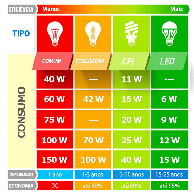 A eficiência do LED reside no fato de que produzem quase a mesma carga de luz (ou lúmem) que as fluorescentes (50 lumens / Watt), consumindo muito menos energia e gerando quase zero calor.