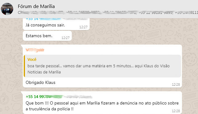 Mensagens no grupo de WhatsApp relatando a situação em SP.