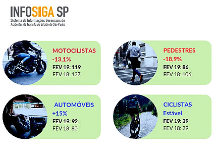 No mês, foram registrados 347 óbitos causados por acidentes em ruas e rodovias, redução de -7,5% na comparação com fevereiro de 2018 (375). A queda no número de casos envolvendo pedestres (-18,9%) e motociclistas (-13,9%) são destaques do levantamento.