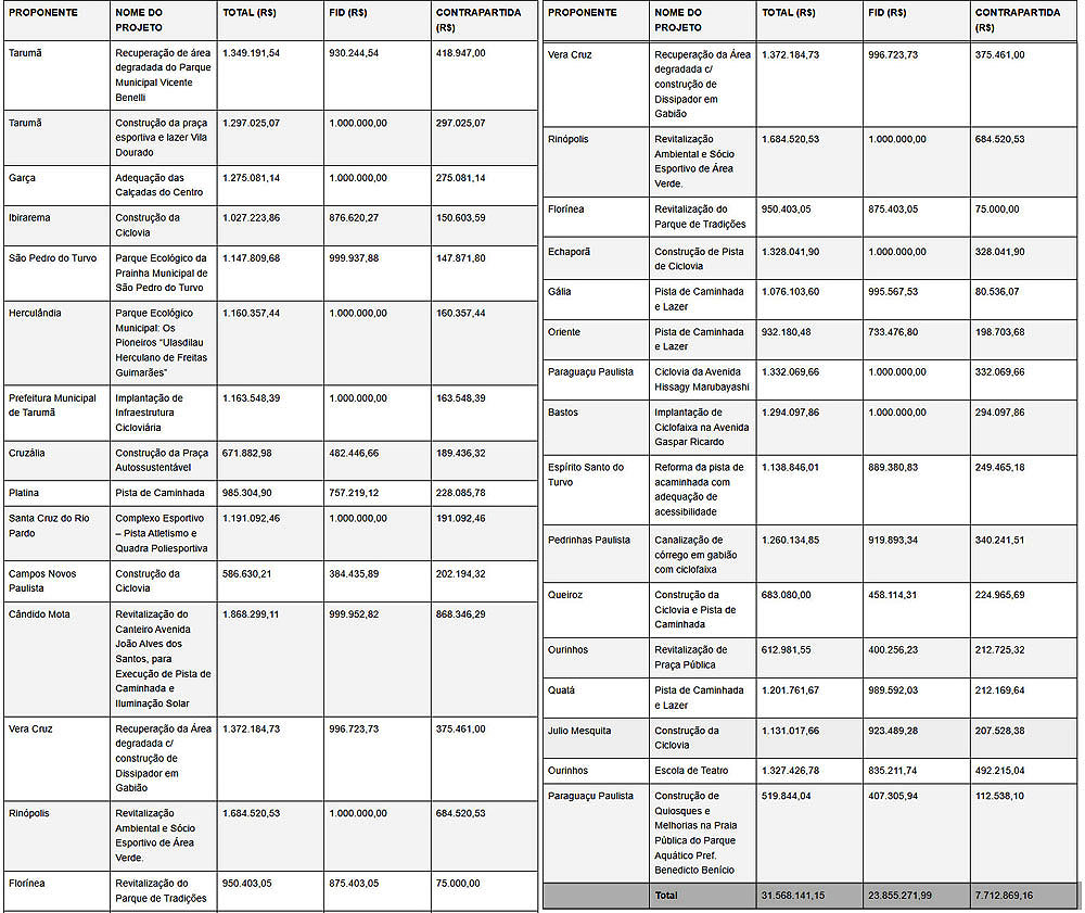 Voltados à preservação ambiental, recuperação de áreas urbanas degradadas e ampliação da mobilidade urbana, os investimentos fazem parte de um aporte total de R$ 316 milhões, sendo R$ 238 milhões do Estado e R$ 78 milhões de contrapartida de prefeituras para o desenvolvimento de 270 projetos em todo o estado.