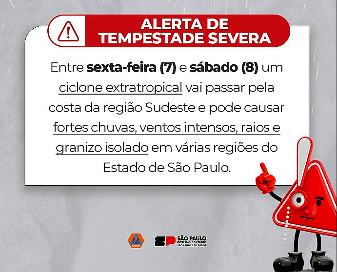 Segundo o órgão, durante o período informado, um sistema meteorológico que atua na costa da região Sudeste favorece a formação de fortes chuvas, acompanhadas de raios, rajadas intensas de vento e possibilidade de granizo isolado em diferentes pontos do estado.