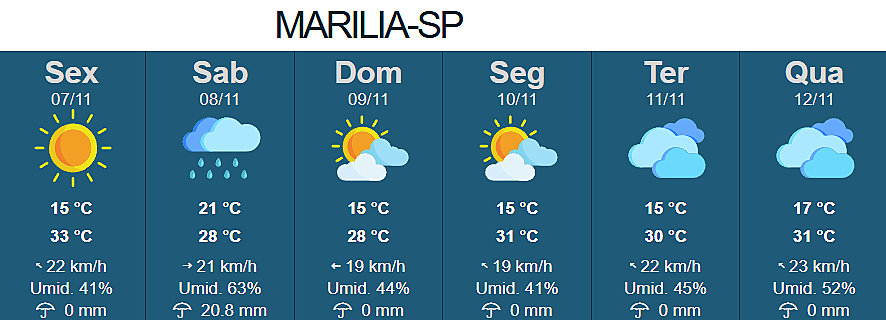 No caso de Marília, por exemplo, esta sexta-feira ainda deve ser ensolarada, segundo previsão do IPMet (Instituto de Pesquisas Meteorológicas) de Bauru. Deve chover apenas no sábado.