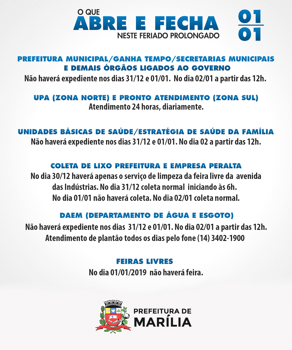 A exemplo do Natal, que neste ano foi comemorado numa terça-feira, o Ano Novo também muda a rotina na prestação de serviços à população em toda região. Em Marília (e boa parte das cidades do Oeste Paulista) na segunda-feira (31) será decretado ponto facultativo. Dessa forma, o paço municipal e quase todas as secretarias só reabrem na quarta-feira, após às 12h.