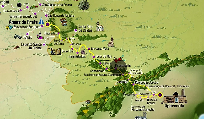 São cerca de 970 km, dos quais aproximadamente 500 km atravessam a Serra da Mantiqueira por estradas vicinais, trilhas, bosques e asfalto, proporcionando momentos de reflexão e fé, saúde física e psicológica e integração do homem com a natureza.