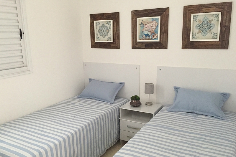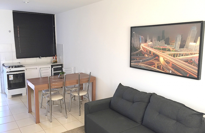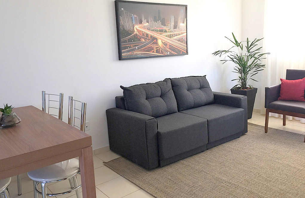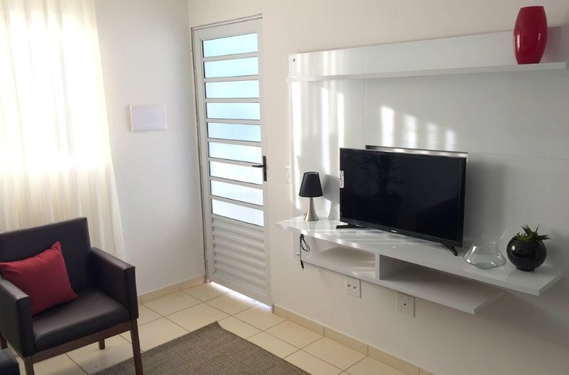 “A construção da sala e da cozinha em ambiente conjugado, uma tendência da família moderna, com janelas em ambos os lados, para ventilação cruzada, possibilita aproveitar espaços sem perder a elegância. Os quartos também possuem espaço para várias composições.”
