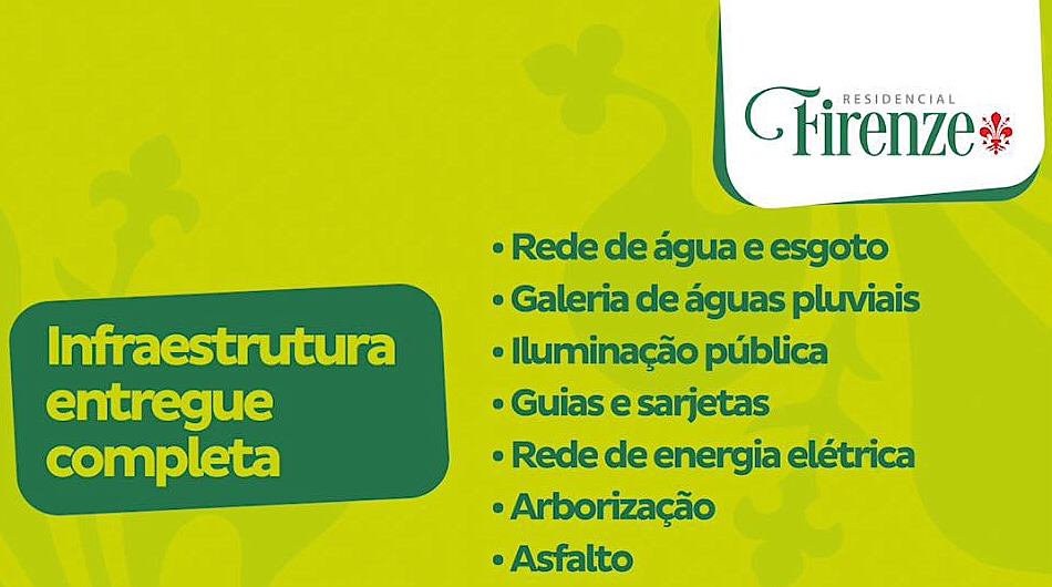 O Residencial Firenze possui infraestrutura completa com rede de água e esgoto, galerias de águas pluviais, iluminação pública, guias e sarjetas, energia elétrica, arborização e asfalto. O terreno tem medida padrão de 144 metros quadrados, permitindo ampliações.
