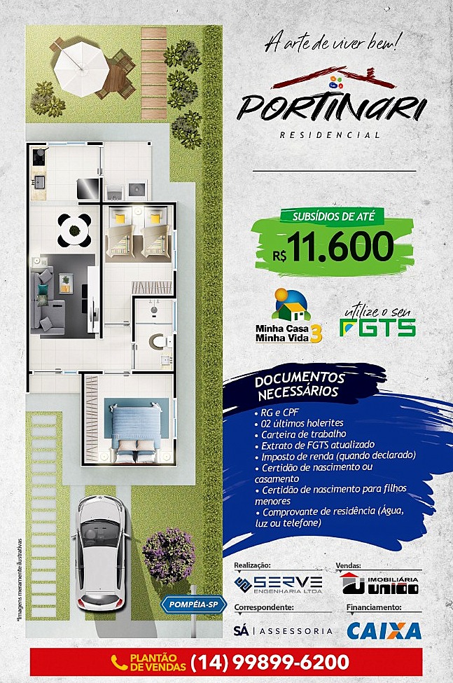 O sonho da casa própria está mais perto de ser realizado pelas famílias de Pompeia. Lançado recentemente pela Serve Engenharia, o residencial Portinari é um sucesso na vizinha cidade. Tanto que restam apenas algumas unidades para comercialização.