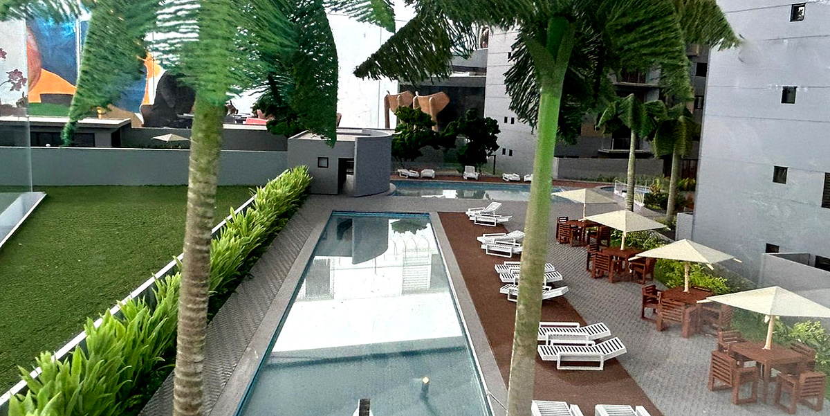 A reprodução em 3D do residencial facilita a visualização dos espaços que serão construídos, como a piscina de raia de 25 metros.