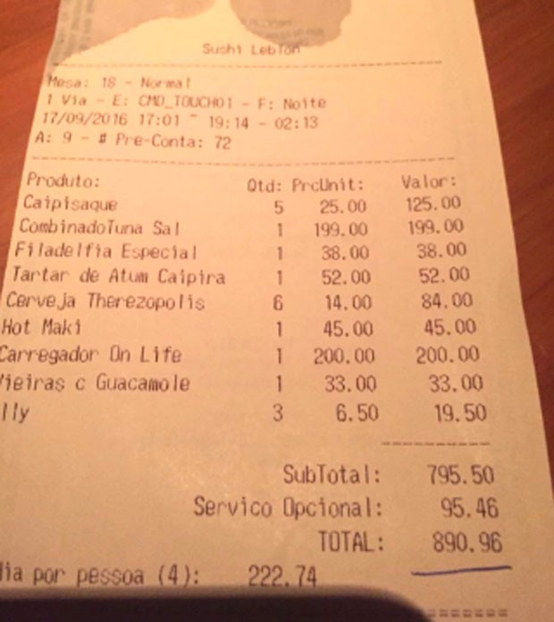 “Quando chegou a conta, a gente foi pagando meio sem conferir. Estava cara, mas como bebemos caipirinha, comemos sushi, achamos que o valor estava correto. O marido de uma das meninas viu na conta o carregador como R$ 200. Reclamamos e o garçom disse que ia estornar. Eu já tinha passado o cartão, minha amiga também”, conta Michelle.