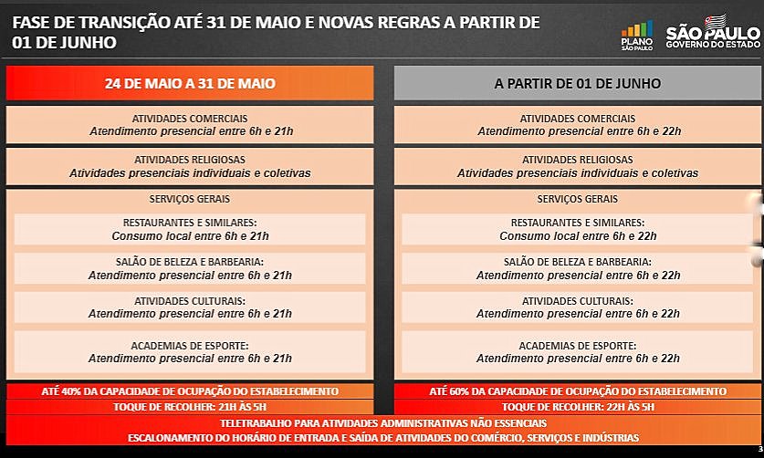 A partir do dia 1 de junho, o Governo de SP vai iniciar uma nova etapa do Plano SP. Entrará em vigor mais uma extensão dos horário dos estabelecimentos comerciais que poderão funcionar até 22h e 60% de ocupação dos locais e testagem rápida de pessoas sintomáticas. Mais detalhes sobre as noras regras, clique AQUI.