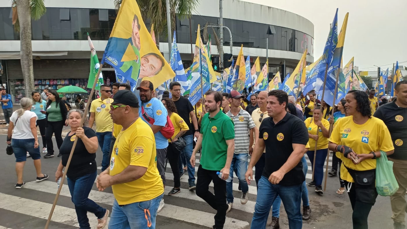 Eles iniciaram a jornada saindo da praça São Bento, com cabos eleitorais e portas-bandeiras, além de candidatos a vereador. O prefeito Daniel Alonso e a primeira-dama Selma Regina também participaram.