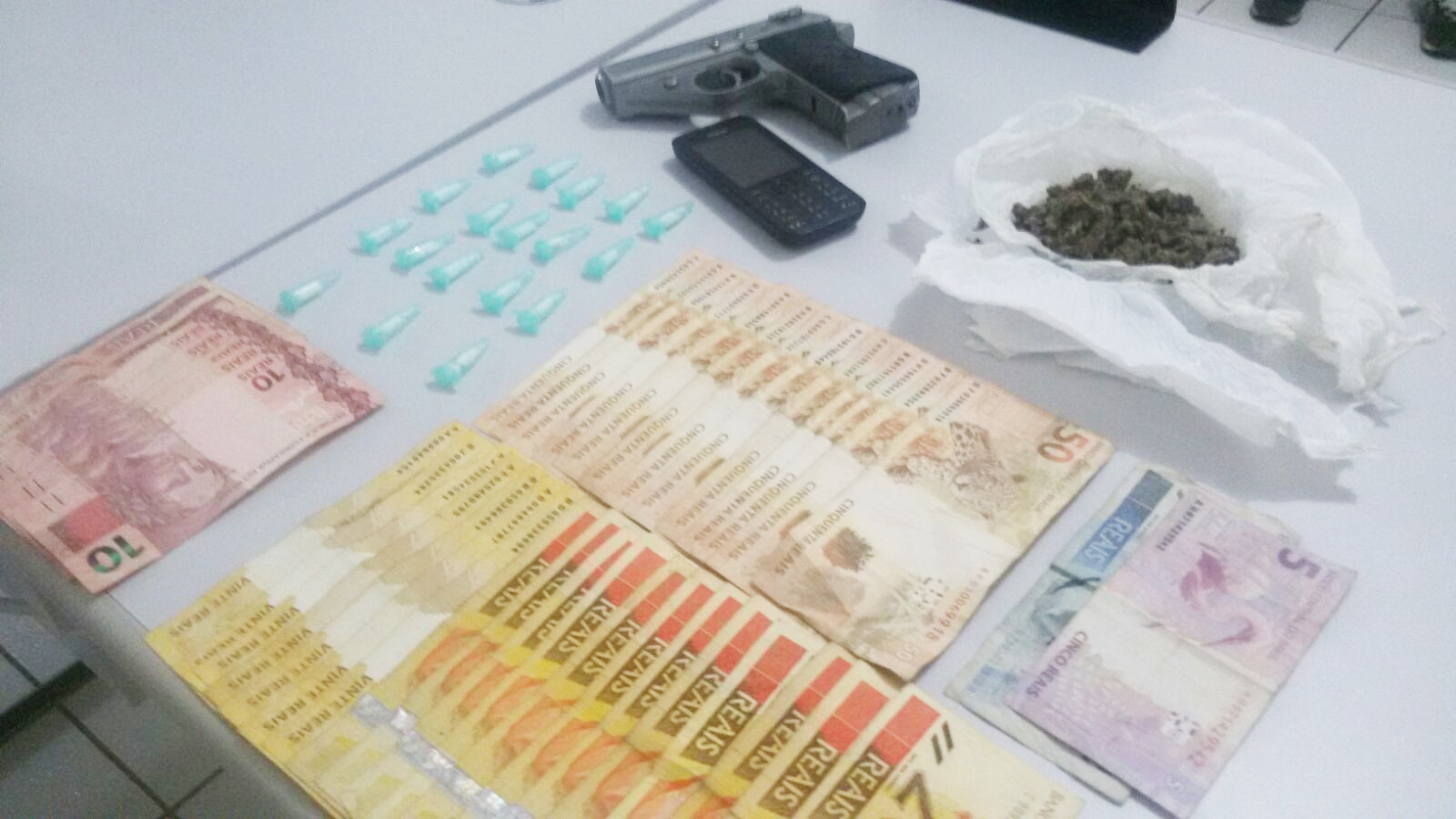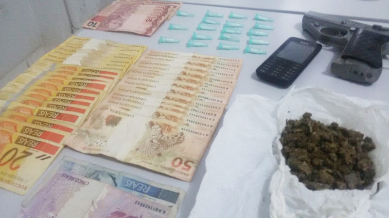 Com ele, a Polícia localizou uma grande porção de maconha, 18 pinos de cocaína, um simulacro de arma e um celular.