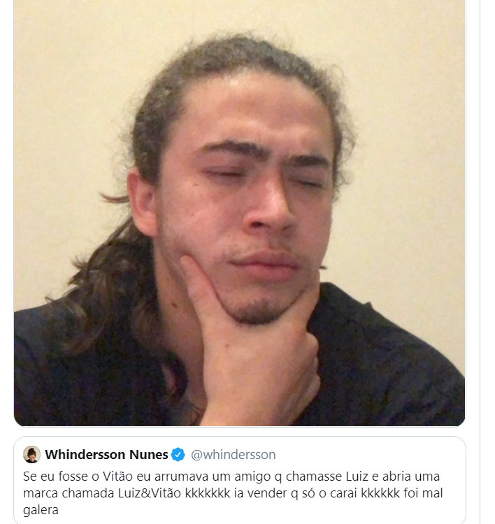 Uma das boas coisas dessa história é ver a reação de Whinderson à história toda. Dores de cotovelo masculinas são, por tradição machista, ocultadas. Ou viram apenas comentários agressivos entre amigos. Whinderson, não. Fez piadas com o assunto (foto abaixo), quando a história estava bombando.