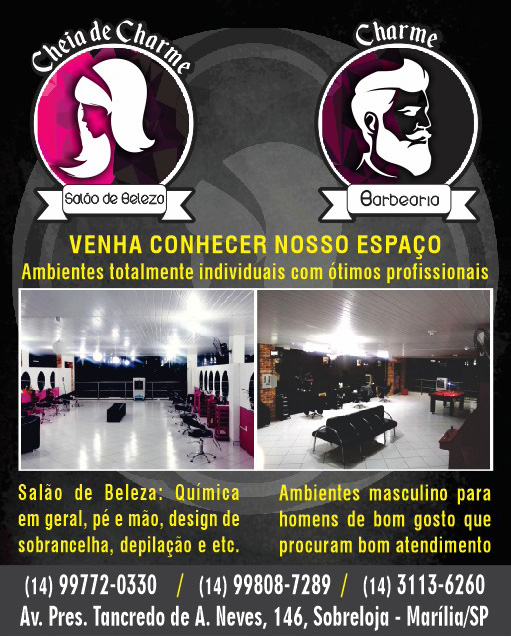 Ao completar três anos de atividades em Marília, o salão de beleza "Cheia de Charme" agora atende toda família mariliense e da região. Além de estética, manicure/pedicure, e tratamento completo para o seu cabelo, traz uma novidade: a Charme Barbearia, também com uma equipe de profissionais para atender aos seus clientes.