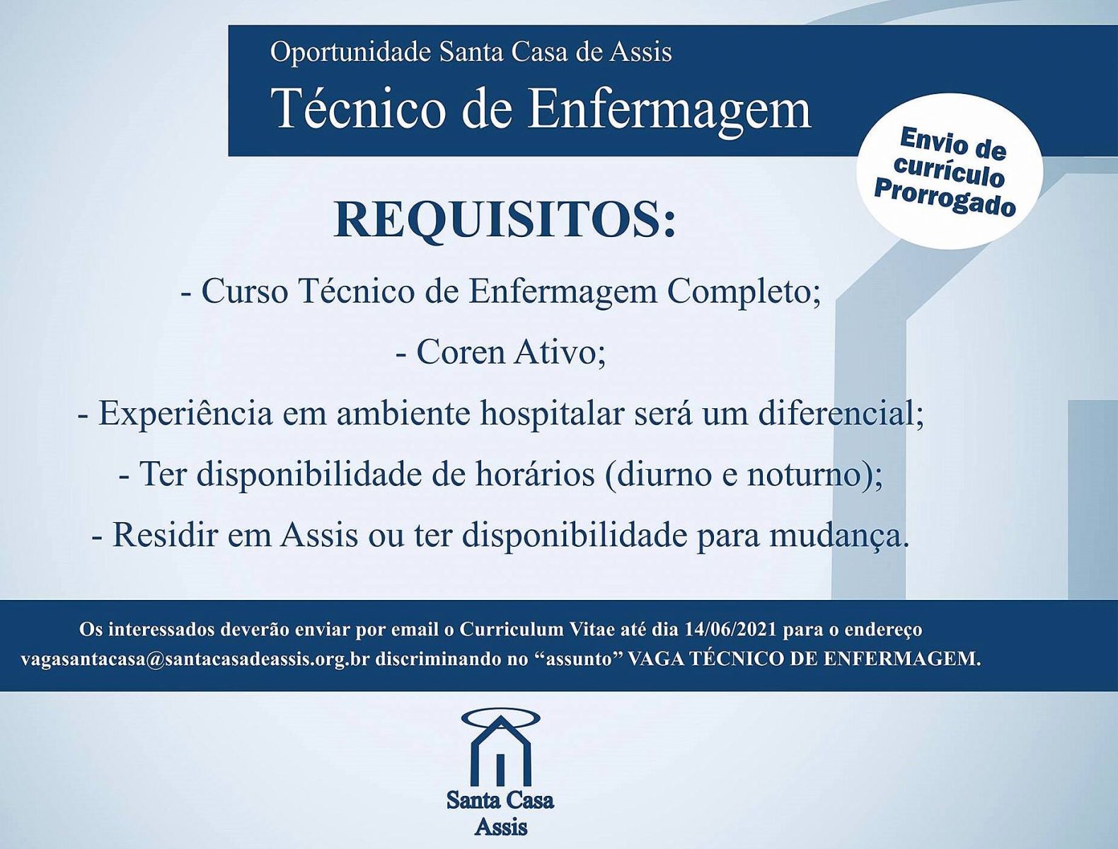 A Santa Casa de Assis está contratando Técnico de Enfermagem, para atuar em sua Unidade Hospitalar. São requisitos para a vaga: