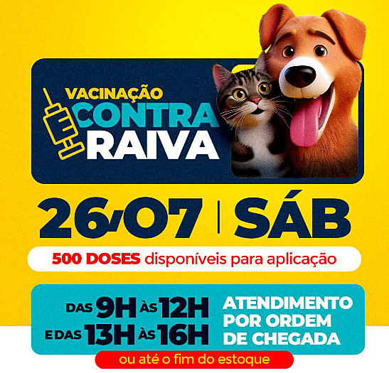 A Secretaria Municipal da Saúde de Marília vai realizar no próximo sábado (26) mais uma vacinação antirrábica, com a disponibilização de 500 doses. A ação acontecerá no bairro Maracá III, zona norte da cidade, das 9h às 12h e das 13h às 16h (ou enquanto durar o estoque).