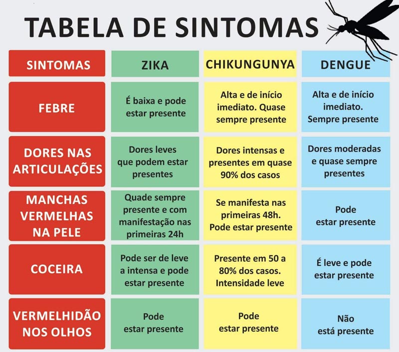 O quadro de febre causado pelo vírus costuma ser mais baixo e as dores nas articulações mais leves. A doença ainda traz como sintomas a hiperemia conjuntival (irritação que deixa os olhos vermelhos, mas sem secreção e sem coceira), dores musculares, dor de cabeça e dor nas costas.