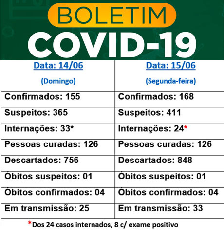 O número de pessoas curadas permaneceu inalterado (126) enquanto que os exames descartados subiu para 848 desde o início da divulgação dos boletins. A Saúde mantém o número de mortes (4) e de mortes suspeitas (01).