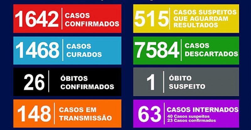 Permanecem em fase de transmissão do vírus 148 pacientes, com um total de 63 internados, dos quais 23 que tiveram exames já confirmados. No momento, pessoas pacientes estão aguardando resultado de exame.