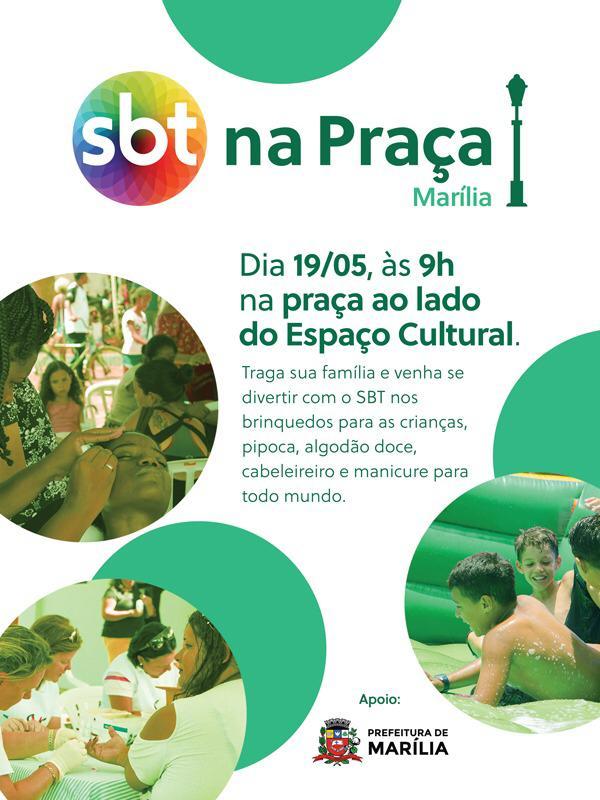 O SBT na Praça, iniciativa da própria emissora, com apoio da Prefeitura de Marília, por meio das secretarias municipais da Cultura, Saúde e Obras Públicas, será realizado neste domingo (19), das 9h às 13h, na praça ao lado do Espaço Cultural “Ezequiel Bambini”, na avenida Sampaio Vidal.
