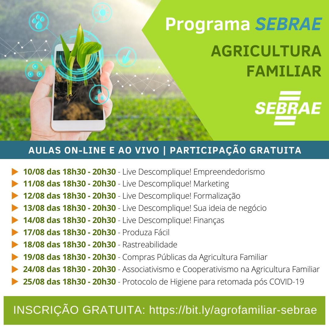As aulas serão realizadas a partir do dia 10 de agosto, sempre das 18h30 às 20h30, sendo que para participar o produtor rural deve fazer a sua inscrição gratuita no seguinte endereço eletrônico: https://bit.ly/agrofamilar-sebrae