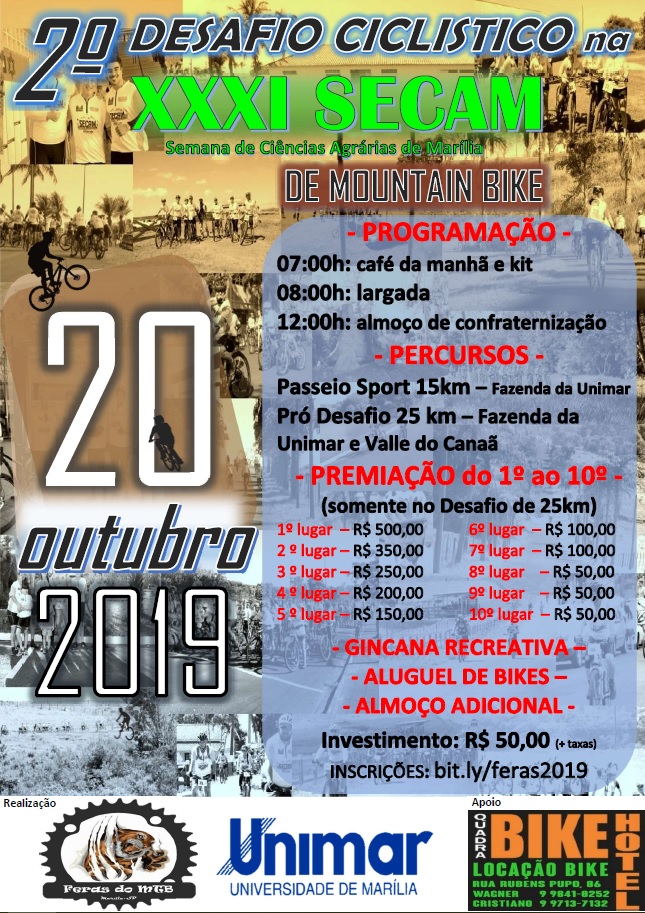Marcando o início da 31ª edição da SECAM (Semana de Ciências Agrárias), da Unimar, será realizado neste domingo o 2º Desafio Ciclístico Feras do Mountain Bike que vai reunir ciclistas de Marília e toda a região.