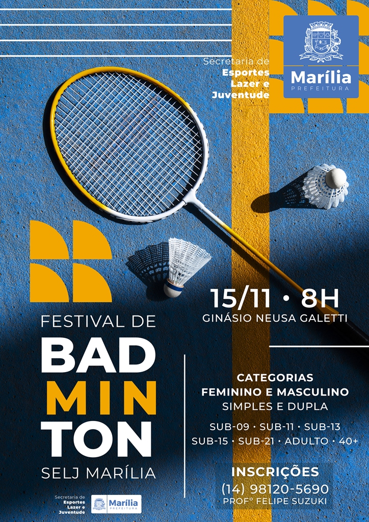 A Secretaria Municipal de Esportes, Lazer e Juventude (SELJ), realiza no próximo dia 15 de novembro (sábado), em Marília, o Festival de Badminton, no Ginásio Neusa Galetti, a partir das 8h.