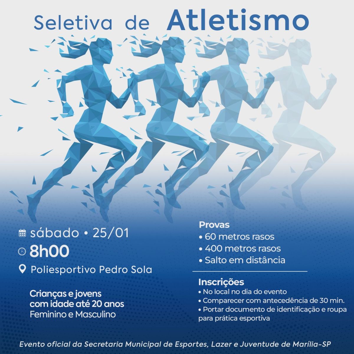 A Secretaria Municipal de Esportes, Lazer e Juventude anuncia que será realizada a seletiva municipal de atletismo neste sábado (25), a partir das 8h, no Poliesportivo Pedro Sola.