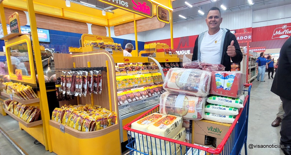 Encontramos mais uma família "vizinha" da loja e que aproveitou a inauguração para fazer compras: a autônoma Marina Breda e o seu primo Divino Luz (empresário - foto) que já estavam com o carrinho de compras praticamente cheio: