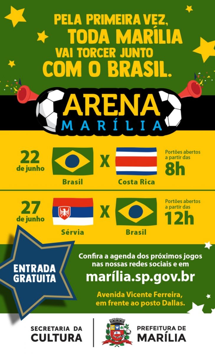 ARENA MARILIA - A exemplo da primeira partida, o jogo contra a Costa Rica os torcedores marilienses poderão acompanhar na Arena Marília, montada na avenida Vicente Ferreira, em frente ao posto Dallas.