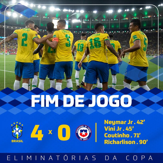 Diante de quase 70 mil torcedores, o Brasil derrotou o Chile por 4 a 0 pela 17ª rodada das Eliminatórias Sul-Americanas para a Copa do Mundo, na noite desta quinta-feira no estádio do Maracanã. A partida foi a última da seleção diante de sua torcida, isto porque os jogos preparatórios para o Mundial serão realizados fora do país.