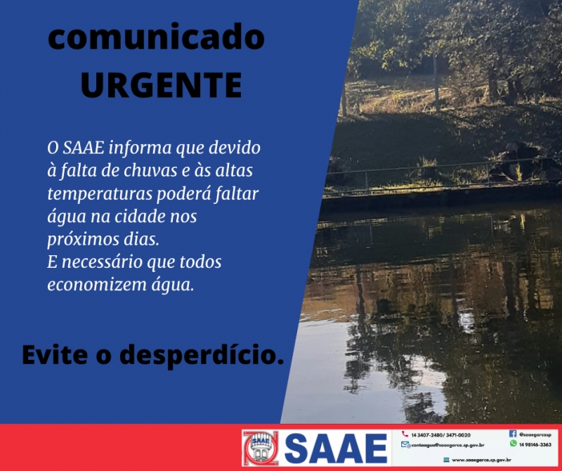 Na corrida contra o tempo, o SAAE coloca em atividade, a partir de setembro a “Operação Estiagem” com o funcionamento do poço profundo para captação de água subterrânea e aumenta a fiscalização para evitar desperdício. Diversos bairros da cidade já sentiram a falta de água.