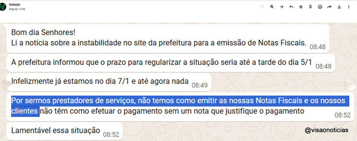 Pela manhã, o Visão Notícias recebeu muitas mensagens de contribuintes reclamando dessa pane que durou mais de 24 horas: "Em emitir nota, nós ficamos sem receber", protestou um empresário. Outro acrescentou "estou com a folha de pagamento em aberto e boletos para pagar. Como posso fazer isso se não consigo emitir notas e receber?"