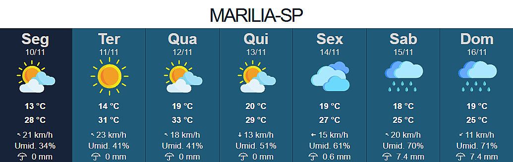 Mas, a partir de quinta-feira, o tempo deve mudar novamente. O Climatempo prevê chuva em Marília já no período da noite, com o tempo permanecendo instável durante todo o fim de semana.