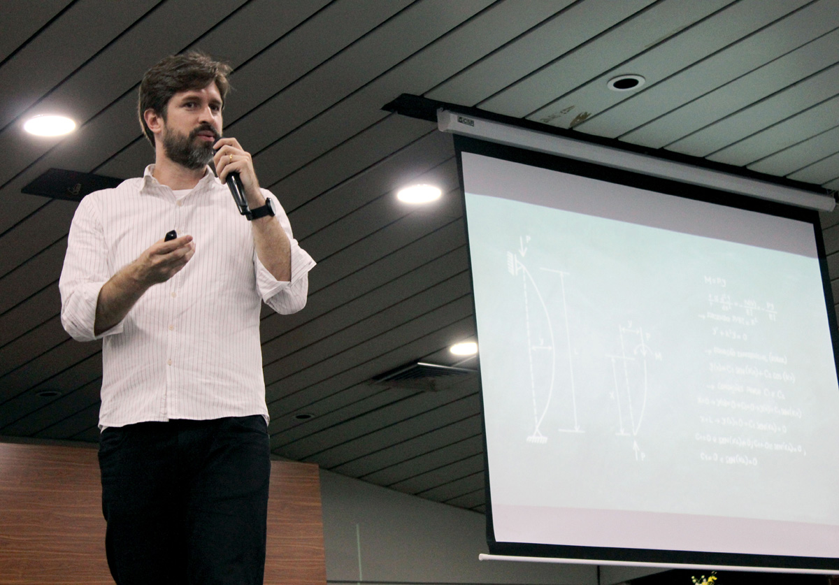 Na abertura, os estudantes receberam o Márcio Sequeira, criador da Mola Model que permite aos alunos aprender o conteúdo de estruturas físicas com mais apoio do que as contas no papel. “Quando eu estava na graduação sentia muita dificuldade em entender algumas disciplinas. Então tive a ideia de criar algo que trouxesse maior qualidade à essa compreensão e pude transformar em produto”, explica.