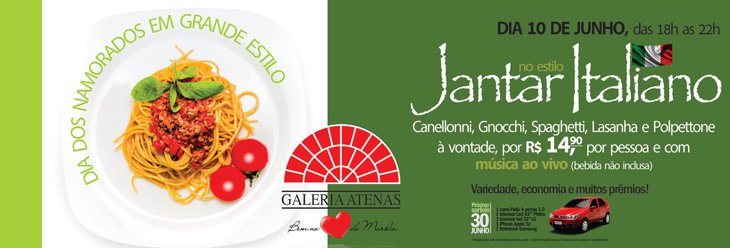 JANTAR ESPECIAL - Como a Galeria Atenas estará aberta até às 22h na sexta-feira (10), será realizado um jantar romântico ao estilo italiano, no restaurante Rafaella's (piso superior) e que também é parceiro nessa promoção.