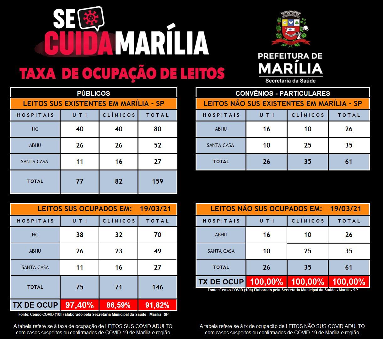 Todos os hospitais de Marília passaram praticamente a semana toda com UTIs, destinadas ao tratamento da Covid-19, tando do SUS como particulares/convênios, totalmente lotadas. Na verdade, essa situação vem ocorrendo desde o começo do mês, com as taxas de ocupação acima de 95%.